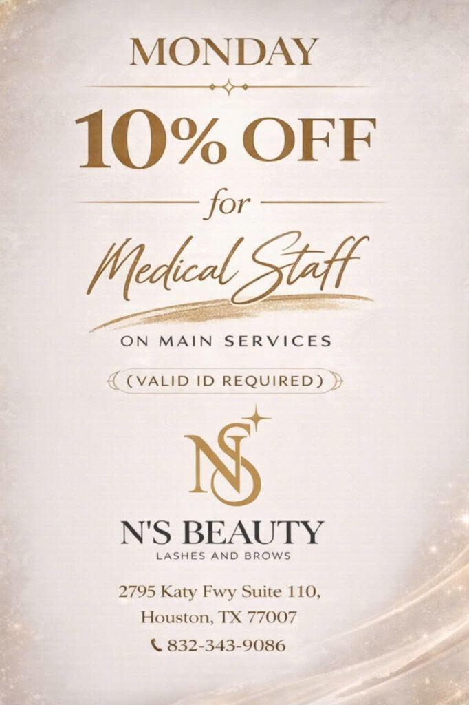 At N’s Beauty, we deeply appreciate the dedication and hard work of healthcare professionals. To show our gratitude, we’re offering an exclusive 10% discount on all main lash and brow services for medical staff in Houston.